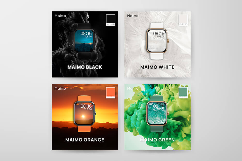 Maimo is a sporty smart watch brand. The design is aimed to express different KSP such as stylish and colourful shape, Exercise Modes and so on.